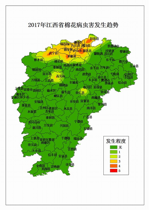 4、氣候因素。 據省氣象部門預計,2017年(nian)汛(xun)期全省總降水量(liang)略偏多,有階(jie)段性低溫連陰雨(yu)天(tian)氣,汛(xun)期贛北(bei)、贛中雨(yu)量(liang)偏多,對苗期病害、枯萎病和棉盲(mang)蝽(chun)的發生(sheng)(sheng)有利(li);伏秋期全省氣溫略偏高(gao),雨(yu)量(liang)略偏少,全省有干旱(han)發生(sheng)(sheng),盛夏高(gao)溫日數略偏多,有利(li)于紅(hong)蜘蛛、斜(xie)紋夜蛾和四、五代棉鈴蟲(chong)等(deng)害蟲(chong)的發生(sheng)(sheng)。