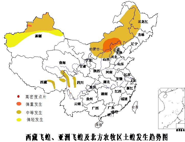4月19日,全國農技(ji)中(zhong)心(xin)組織河北(bei)、山(shan)西(xi)、內蒙古、吉林、黑龍江(jiang)以(yi)及(ji)四川、西(xi)藏、新疆(jiang)等省(自(zi)治區(qu))的測(ce)(ce)報(bao)(bao)技(ji)術(shu)人員,開展了(le)2017年西(xi)藏飛(fei)蝗(huang)(huang)、亞洲飛(fei)蝗(huang)(huang)與(yu)北(bei)方(fang)農牧交(jiao)錯(cuo)區(qu)土蝗(huang)(huang)發(fa)生(sheng)趨勢(shi)網(wang)絡會(hui)商。參與(yu)會(hui)商的測(ce)(ce)報(bao)(bao)技(ji)術(shu)人員根據去秋殘(can)蝗(huang)(huang)基數、今春(chun)挖(wa)卵調查結(jie)(jie)果,結(jie)(jie)合蝗(huang)(huang)區(qu)生(sheng)態環境和(he)氣候(hou)條(tiao)件等因素(su)綜(zong)合分析,預計2017年西(xi)藏飛(fei)蝗(huang)(huang)、北(bei)方(fang)農牧區(qu)土蝗(huang)(huang)總體中(zhong)等發(fa)生(sheng),亞洲飛(fei)蝗(huang)(huang)偏輕(qing)發(fa)生(sheng),局部(bu)地區(qu)有出現高(gao)密度蝗(huang)(huang)蝻點片(pian)的可能。