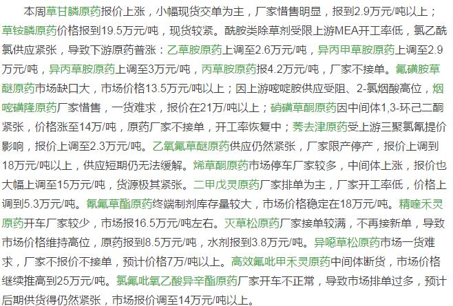 9月下旬國內農藥原藥殺蟲劑價格行情