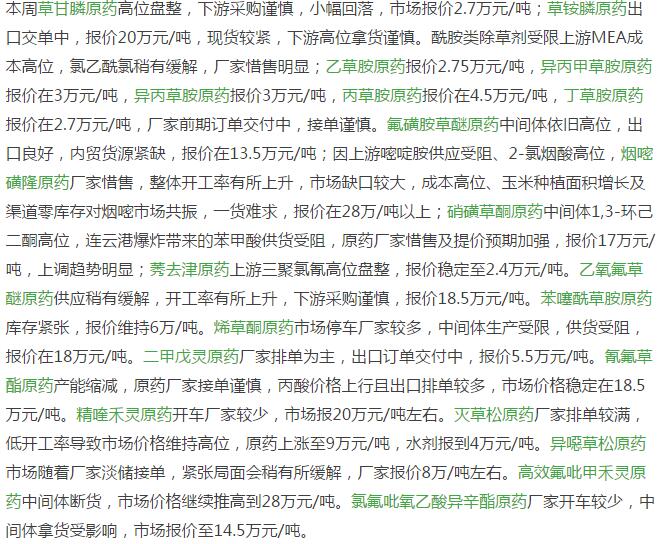 12月中旬農藥原藥除草劑價格行情