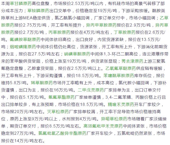 3月第三周國內農藥原藥除草劑價格行情