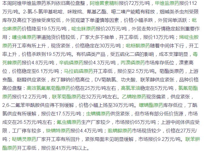 3月第三周國內農藥原藥殺蟲劑價格行情