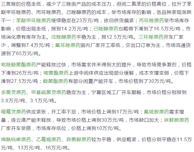 多款原藥貨源緊張價格提升