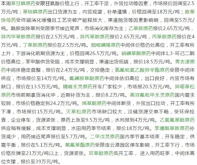4月下旬國內農藥原藥除草劑市場行情
