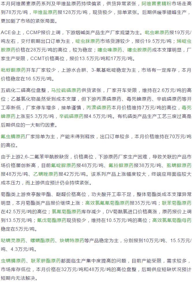10月中旬國內農藥原藥殺蟲劑市場行情走勢