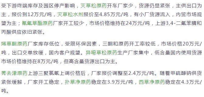 12月末國內農藥原藥除草劑價格走勢