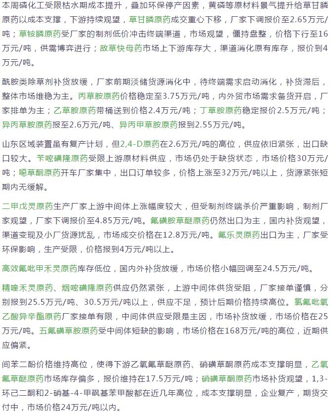 11月底國內農藥原藥除草劑價格走勢