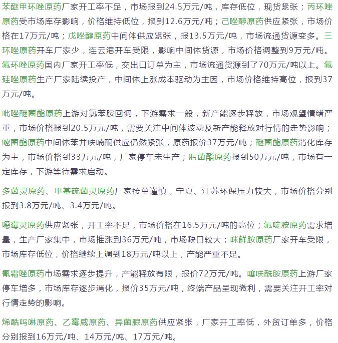 多款原藥貨源緊張價格提升