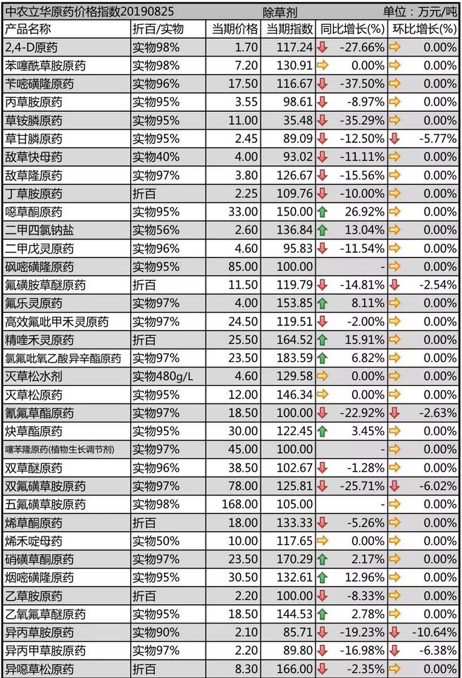 莠(you)去(qu)津(jin)原(yuan)(yuan)藥市場低迷,廠家庫存較大,報(bao)價2.2萬元/噸(dun)。苯酚價格低位(wei),2,4-D原(yuan)(yuan)藥開工(gong)率(lv)增加,報(bao)價1.7萬元/噸(dun)。噁草(cao)酮(tong)原(yuan)(yuan)藥廠家停產影響,缺口較大,報(bao)價33萬元/噸(dun)的(de)高位(wei),供應仍然十分緊張。