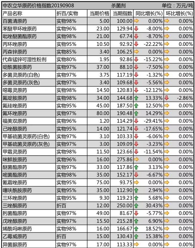 多菌靈原藥、甲基硫菌靈原藥生產廠家環保壓力較大,庫存低位,但出口需求一般,市場價格分別報到3.75萬元/噸、3.1萬元/噸,較為穩定。噁霉靈原藥市場價格穩定在14.5萬元/噸左右,但開車廠家減少;氟啶胺原藥需求增量,生產廠家集中,但備貨季節已過,目前價格在35萬元/噸,上游中間體缺口較大;咪鮮胺原藥廠家開車受限,市場庫存低位,價格報到16萬元/噸,產量嚴重不足。