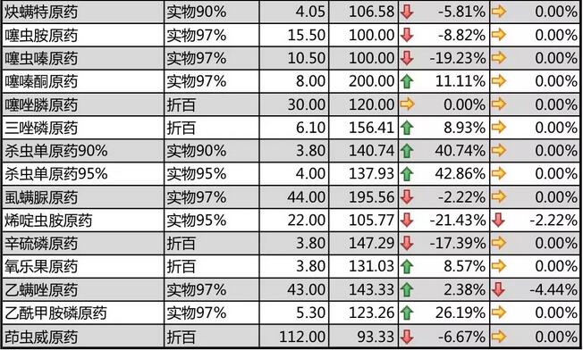 噠螨靈原藥開車廠家極少,市場貨源極其有限,報價到了11.7萬元/噸;螺螨酯原藥、炔螨特原藥等分別報到13萬元/噸、4.05萬元/噸,市場淡季需求較少。