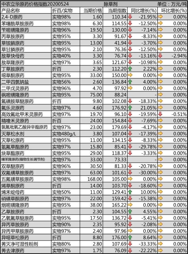 2,4-D原藥庫存(cun)(cun)減少,廠家排(pai)單增(zeng)多,價格報(bao)到1.6萬(wan)(wan)元(yuan)(yuan)/噸;噁草酮(tong)原藥開車廠家極少,出口訂單缺口較大,報(bao)價在33萬(wan)(wan)元(yuan)(yuan)/噸的高位,供應仍然十分緊張;莠去津原藥廠家庫存(cun)(cun)較大,報(bao)價1.75萬(wan)(wan)元(yuan)(yuan)/噸。