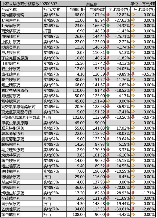馬拉硫(liu)磷(lin)原(yuan)(yuan)藥(yao)受蝗災出口訂單增(zeng)多的影響,市場依舊在(zai)(zai)2.9萬(wan)(wan)(wan)元(yuan)/噸(dun)的高位;丙(bing)溴磷(lin)原(yuan)(yuan)藥(yao)穩定在(zai)(zai)6.9萬(wan)(wan)(wan)元(yuan)/噸(dun);毒死蜱原(yuan)(yuan)藥(yao)出口減量,開工率增(zeng)加,價(jia)格回調到(dao)4.1萬(wan)(wan)(wan)元(yuan)/噸(dun);辛(xin)硫(liu)磷(lin)原(yuan)(yuan)藥(yao)需求弱(ruo)勢,下(xia)調報價(jia)3.4萬(wan)(wan)(wan)元(yuan)/噸(dun)。