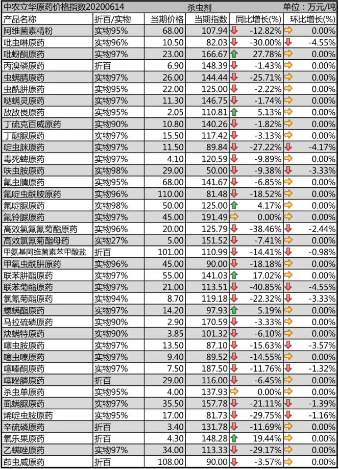 阿維菌素精粉市場穩定,報價68萬元/噸。甲氨基阿維菌素苯甲酸鹽原藥保持穩定,出口訂單開始增多,但整體下行的環境,讓市場價格走低到101萬(wan)元/噸。