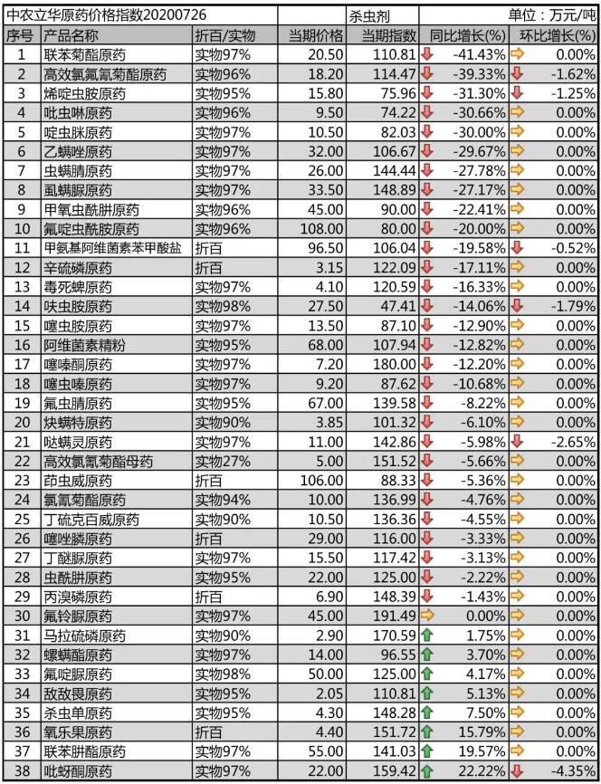 氟蟲腈(jing)原(yuan)藥(yao)廠家出口為主,目前價格(ge)報(bao)67萬(wan)元(yuan)/噸(dun)(dun);氟啶脲原(yuan)藥(yao)供(gong)(gong)貨偏緊,報(bao)50萬(wan)元(yuan)/噸(dun)(dun);氟鈴脲原(yuan)藥(yao)報(bao)45萬(wan)元(yuan)/噸(dun)(dun);虱螨脲原(yuan)藥(yao)沖高(gao)回落,市場供(gong)(gong)應(ying)穩定,價格(ge)到33.5萬(wan)元(yuan)/噸(dun)(dun);乙螨唑原(yuan)藥(yao)供(gong)(gong)應(ying)增多,需求一般,報(bao)價32萬(wan)元(yuan)/噸(dun)(dun)。