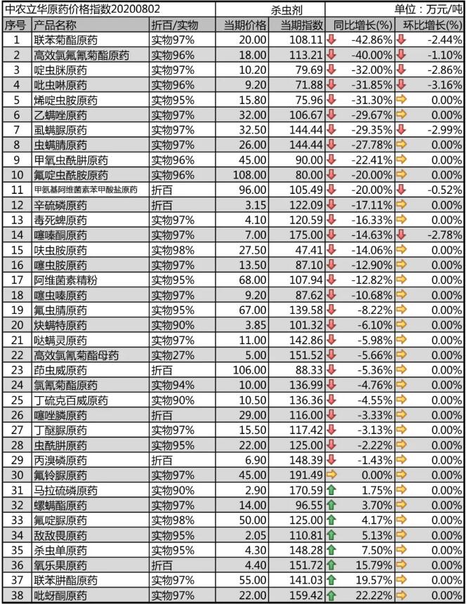 氟蟲腈原(yuan)藥(yao)廠家以出口為主,目(mu)(mu)前價(jia)(jia)(jia)格報(bao)(bao)67萬(wan)(wan)元(yuan)/噸;隨(sui)著需求(qiu)的提升,目(mu)(mu)前氟啶脲(niao)原(yuan)藥(yao)供(gong)貨(huo)偏緊,報(bao)(bao)50萬(wan)(wan)元(yuan)/噸;氟鈴脲(niao)原(yuan)藥(yao)報(bao)(bao)45萬(wan)(wan)元(yuan)/噸;虱(shi)螨脲(niao)原(yuan)藥(yao)庫存增加,終端制劑(ji)價(jia)(jia)(jia)格競爭激烈(lie),原(yuan)藥(yao)價(jia)(jia)(jia)格沖高回落(luo),報(bao)(bao)32.5萬(wan)(wan)元(yuan)/噸;乙螨唑原(yuan)藥(yao)用藥(yao)季(ji)節后期,報(bao)(bao)價(jia)(jia)(jia)32萬(wan)(wan)元(yuan)/噸。