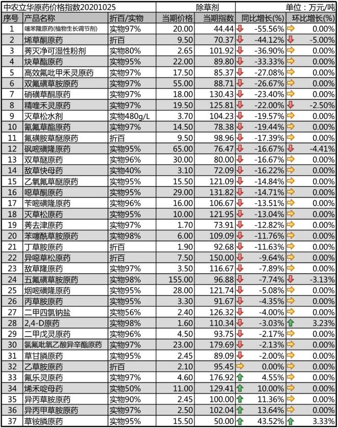 烯草酮原(yuan)藥(yao)新增產(chan)能較(jiao)多(duo),期貨價(jia)(jia)格(ge)(ge)遠低于現(xian)貨價(jia)(jia)格(ge)(ge),目前價(jia)(jia)格(ge)(ge)回(hui)落至(zhi)9.5萬(wan)元(yuan)/噸(dun),出(chu)口為主(zhu),預計(ji)后期廠家競爭加(jia)劇,仍將(jiang)維持低位。異噁草松原(yuan)藥(yao)廠家開始接淡儲(chu)訂單,國內市(shi)場(chang)低含量貨源價(jia)(jia)格(ge)(ge)維持在7.5萬(wan)元(yuan)/噸(dun)。雙氟磺草胺原(yuan)藥(yao)市(shi)場(chang)競爭加(jia)劇,價(jia)(jia)格(ge)(ge)回(hui)落至(zhi)55萬(wan)元(yuan)/噸(dun)以內,市(shi)場(chang)處于觀望狀態;噻苯隆原(yuan)藥(yao)市(shi)場(chang)報(bao)價(jia)(jia)20萬(wan)元(yuan)/噸(dun),價(jia)(jia)格(ge)(ge)大(da)幅下(xia)行(xing),現(xian)有(you)產(chan)能阻止(zhi)新增產(chan)能的(de)一個策略;砜嘧磺隆原(yuan)藥(yao)需求弱勢,市(shi)場(chang)報(bao)價(jia)(jia)65萬(wan)元(yuan)/噸(dun),出(chu)口為主(zhu)。