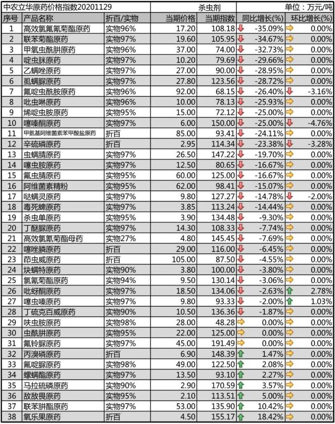 氟蟲腈原(yuan)藥(yao)(yao)(yao)(yao)廠家以出口為主,目前價格(ge)(ge)報60萬(wan)元(yuan)(yuan)/噸(dun)(dun)(dun)(dun);隨(sui)著需求的提(ti)升,目前氟啶脲原(yuan)藥(yao)(yao)(yao)(yao)供貨廠家少,報49萬(wan)元(yuan)(yuan)/噸(dun)(dun)(dun)(dun);氟鈴脲原(yuan)藥(yao)(yao)(yao)(yao)報45萬(wan)元(yuan)(yuan)/噸(dun)(dun)(dun)(dun);虱螨(man)脲原(yuan)藥(yao)(yao)(yao)(yao)庫存(cun)增加(jia),終端制劑價格(ge)(ge)競爭激烈,原(yuan)藥(yao)(yao)(yao)(yao)價格(ge)(ge)沖高回落,報27.8萬(wan)元(yuan)(yuan)/噸(dun)(dun)(dun)(dun);乙螨(man)唑原(yuan)藥(yao)(yao)(yao)(yao)庫存(cun)低位,報價上調到27萬(wan)元(yuan)(yuan)/噸(dun)(dun)(dun)(dun)。