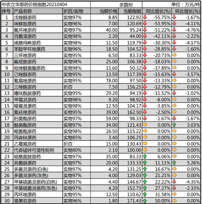 苯醚甲環唑原藥價格稍有回落,市場價格(ge)18.5萬(wan)(wan)(wan)(wan)元(yuan)/噸(dun)(dun);丙環唑(zuo)原(yuan)藥出口訂(ding)單(dan)的增(zeng)(zeng)多,導致廠(chang)家(jia)忙于(yu)交付前期(qi)訂(ding)單(dan),目(mu)前價格(ge)報12.5萬(wan)(wan)(wan)(wan)元(yuan)/噸(dun)(dun);己唑(zuo)醇原(yuan)藥市(shi)場(chang)貨源(yuan)(yuan)增(zeng)(zeng)多,開工率提(ti)升,市(shi)場(chang)價格(ge)有所回落(luo),報到(dao)13.5萬(wan)(wan)(wan)(wan)元(yuan)/噸(dun)(dun);戊唑(zuo)醇原(yuan)藥廠(chang)家(jia)開工率提(ti)升,渠道變(bian)現貨源(yuan)(yuan)增(zeng)(zeng)多,目(mu)前報價回調到(dao)8.85萬(wan)(wan)(wan)(wan)元(yuan)/噸(dun)(dun);三環唑(zuo)原(yuan)藥廠(chang)家(jia)開工率有所提(ti)升,但(dan)基(ji)礎原(yuan)材料(liao)上漲帶(dai)來了成(cheng)本壓力,市(shi)場(chang)價格(ge)報到(dao)6.5萬(wan)(wan)(wan)(wan)元(yuan)/噸(dun)(dun);氟環唑(zuo)原(yuan)藥市(shi)場(chang)開工率提(ti)升,流(liu)通貨源(yuan)(yuan)價格(ge)下(xia)滑到(dao)40萬(wan)(wan)(wan)(wan)元(yuan)/噸(dun)(dun),隨著價格(ge)下(xia)行,終端制劑(ji)的性價比提(ti)升。