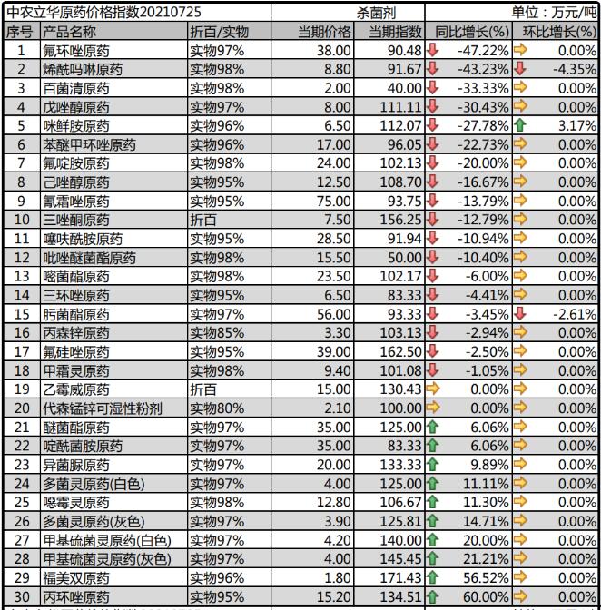 苯醚甲環唑原藥目前穩中走低,供應增加,市場價格報17萬元/噸;丙環唑原藥廠家忙于交付前期訂單,成本高位,開工率不足,價格上漲到15.2萬元/噸;己唑醇原藥市場供應增加,價格報到12.5萬元/噸;戊唑醇原藥庫存降低,目前報到8萬元/噸;三環唑原藥廠家開工率低,基礎原材料上漲帶來了成本壓力,市場價格報到6.5萬元/噸;氟環唑原藥市場開工率提升,流通貨源價格下滑到38萬元/噸,隨著價格下行,終端制劑的性價比提升。