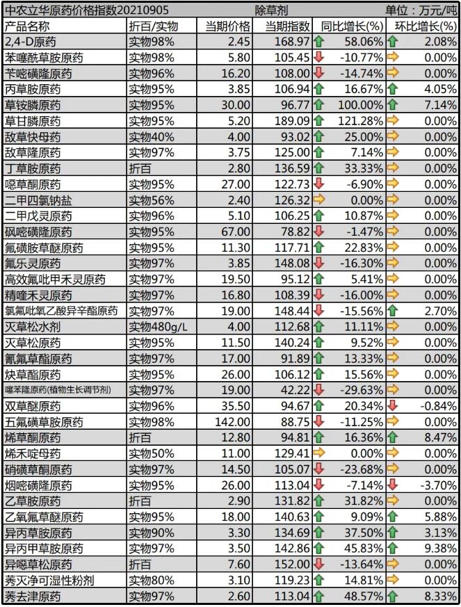 受原材料高位、環保督查影響產能下降預期,國際市場需求良好,國內逐漸進入備貨窗口期,草甘膦原藥維持高位,目前報價5.2萬元/噸以上,貨源偏緊,廠家接單意愿不強,預計后期仍會維持高位;草銨膦原藥目前供應依舊緊張,出口為主,開工率依舊不足,內貿需求因價格高位有所減量,目前報到30萬元/噸;敵草快母藥原材料持續上漲,成本高位疊加出口增量,價格也緊跟其他品種之后,報到萬4萬元/噸。