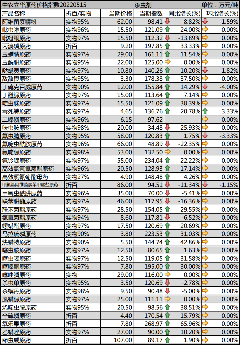 噠螨靈原藥報價到10.8萬元/噸左右,較為穩定;螺螨酯原藥開工率低,市場穩定,報到17.5萬元/噸左右;炔螨特原藥庫存消化,市場報5.5萬元/噸;茚蟲威原藥需求啟動,市場穩定在107萬元/噸左右,受疫情影響,供應受到影響。