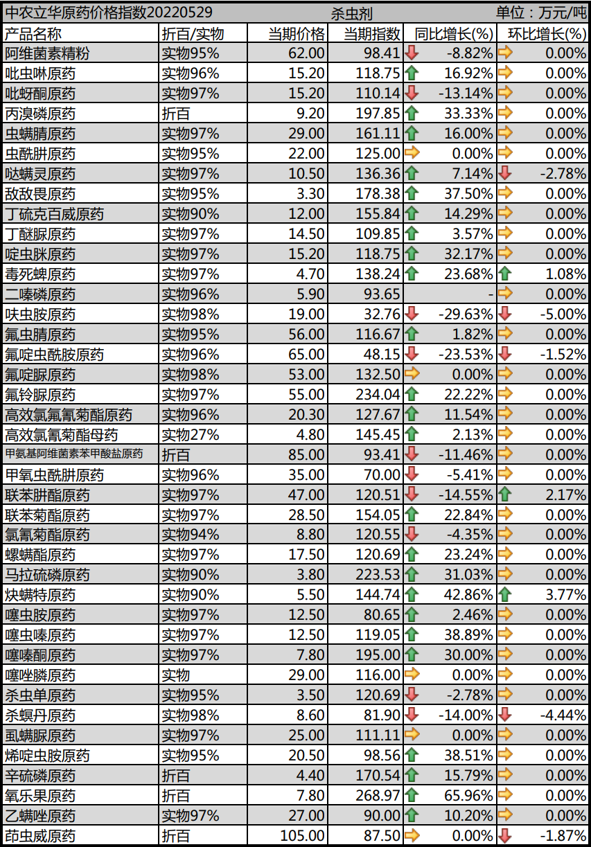 吡蚜酮原藥終端需求低迷,廠家幾無利潤,處理庫存為主,本月市場穩定在15.2萬元/噸;氟啶蟲酰胺原藥終端需求低迷,市場觀望情緒重,市場成交在65萬元/噸。