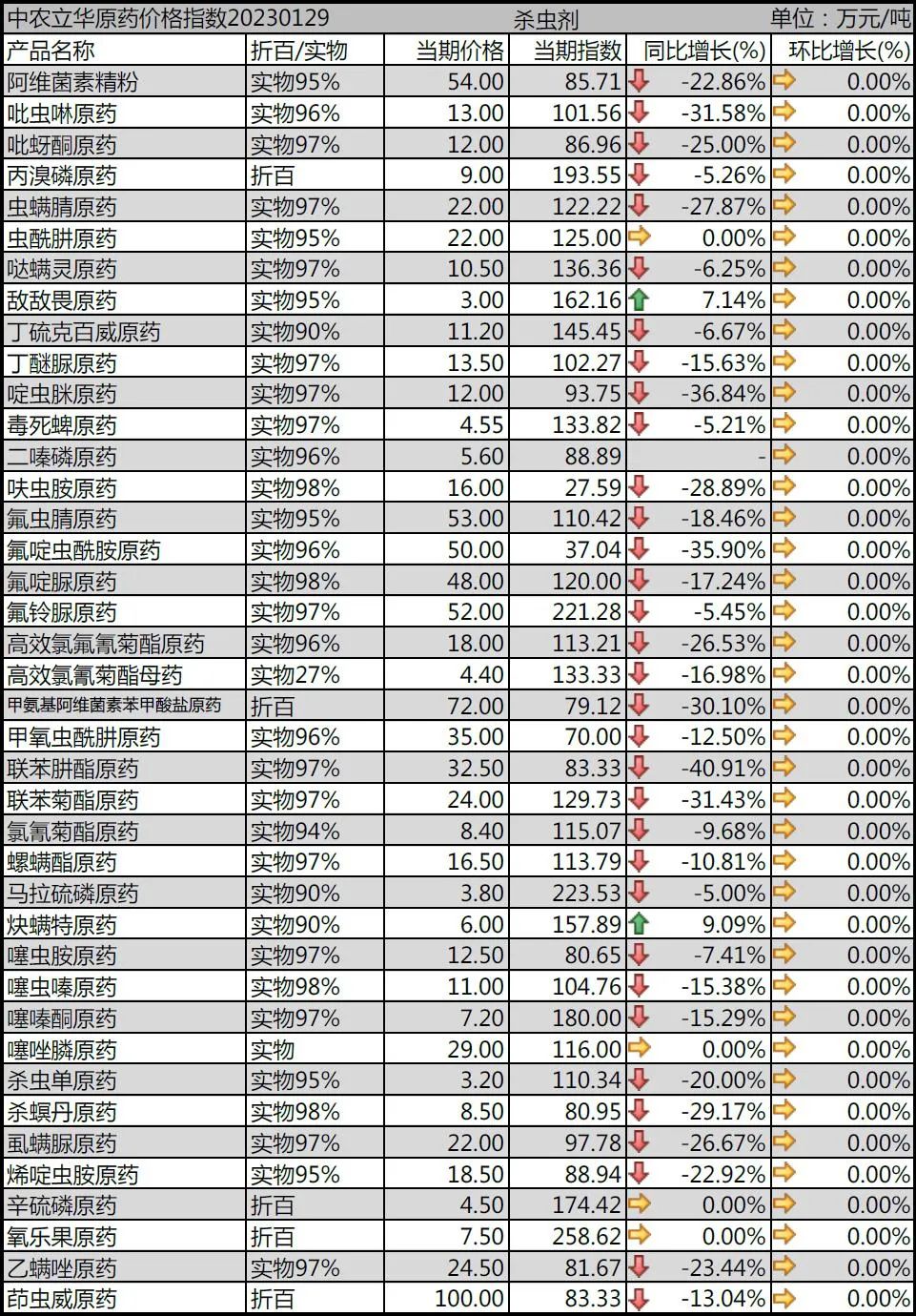 吡蚜酮原藥終端需求低迷,原材料下行,本月市場繼續下行,報到12萬元/噸,市場成交偏低;氟啶蟲酰胺原藥終端需求低迷,市場觀望情緒重,市場走到50萬元/噸。