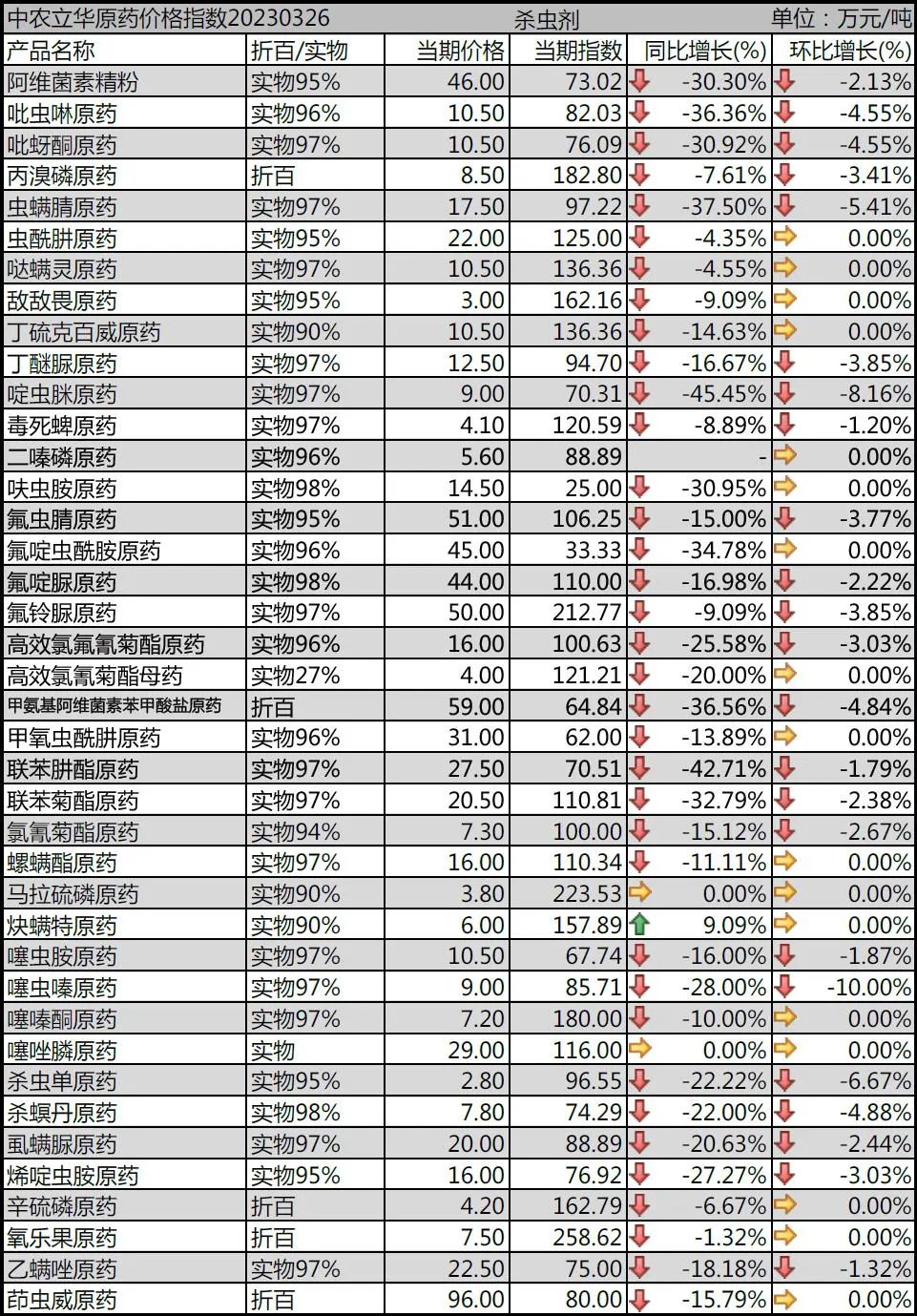 吡蚜酮原藥終端需求低迷,廠家競爭激烈,市場報到10.5萬元/噸;氟啶蟲酰胺原藥終端備貨中,價格盤整,終端性價比逐步提高,報到45萬元/噸。