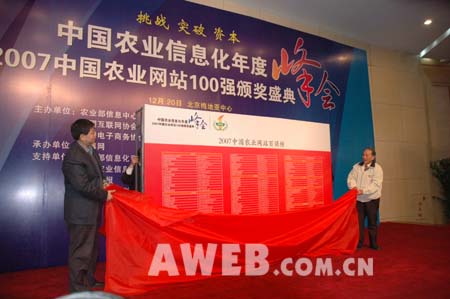 由農業(ye)部信息(xi)中心(xin)、中國(guo)互聯(lian)網協會(hui)、中國(guo)電(dian)子商務(wu)協會(hui)共同主辦,農博網承辦的(de)中國(guo)農業(ye)信息(xi)化年度峰會(hui)暨2007中國(guo)農業(ye)網站100強頒獎盛典(dian)12月(yue)20日在北(bei)京梅地(di)亞中心(xin)隆重舉行。