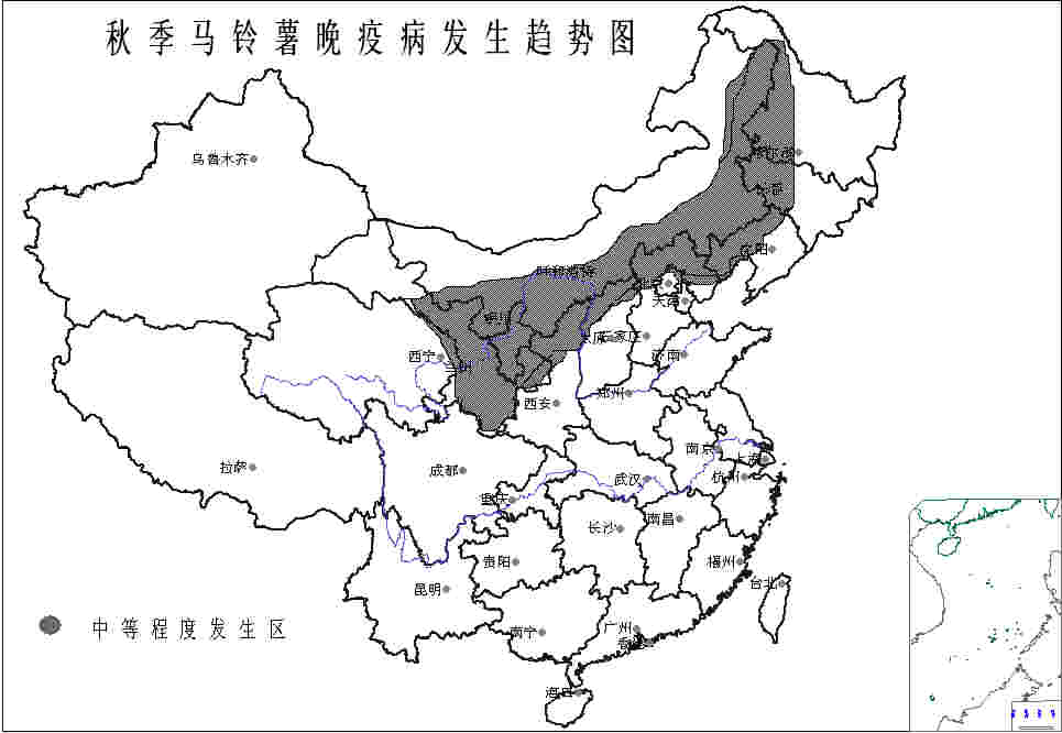 根據當(dang)前各主產(chan)(chan)區(qu)(qu)馬鈴薯種植(zhi)與長勢情況、晚(wan)疫病(bing)發(fa)生流行(xing)特點和(he)國家氣候(hou)中心氣候(hou)預測結果(guo)綜合(he)分析,預計秋季(ji)馬鈴薯晚(wan)疫病(bing)在西北(bei)東部(bu)、華北(bei)北(bei)部(bu)、東北(bei)西部(bu)和(he)西南局部(bu)馬鈴薯產(chan)(chan)區(qu)(qu)中等(deng)流行(xing)(3級(ji)),部(bu)分地區(qu)(qu)偏重流行(xing)(4級(ji)),發(fa)病(bing)面積2250萬(wan)畝。