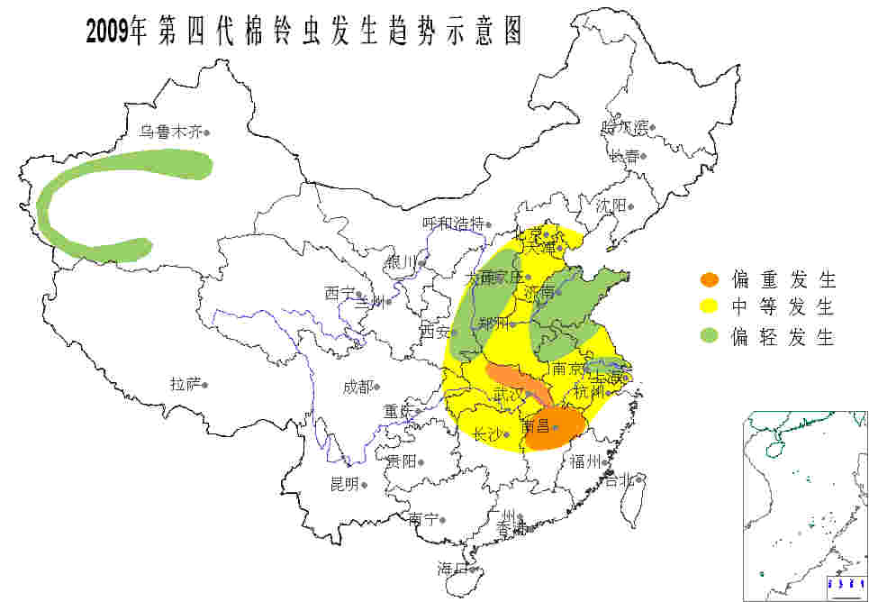 目前(qian),全國大部(bu)(bu)棉(mian)(mian)區(qu)(qu)棉(mian)(mian)花(hua)處于花(hua)鈴期(qi)。根據各(ge)棉(mian)(mian)區(qu)(qu)病蟲(chong)(chong)測(ce)報區(qu)(qu)域站對三代(dai)(dai)棉(mian)(mian)鈴蟲(chong)(chong)總(zong)殘蟲(chong)(chong)量監(jian)測(ce),結(jie)合棉(mian)(mian)花(hua)長(chang)勢(shi)和8月(yue)份氣象條件(jian)綜合分析,預(yu)計(ji)第四代(dai)(dai)棉(mian)(mian)鈴蟲(chong)(chong)在(zai)江(jiang)西(xi)、湖(hu)北東部(bu)(bu)和北部(bu)(bu)偏(pian)重發(fa)生(sheng),湖(hu)北江(jiang)漢平原、湖(hu)南(nan)、安(an)徽沿江(jiang)、江(jiang)蘇沿海、河(he)南(nan)、河(he)北、天(tian)(tian)津中等發(fa)生(sheng),安(an)徽淮北、江(jiang)蘇沿江(jiang)和淮北、山東、山西(xi)、陜西(xi)、新疆(南(nan)疆)偏(pian)輕(qing)發(fa)生(sheng);預(yu)計(ji)發(fa)生(sheng)面積(ji)3000萬(wan)畝(mu)。第三代(dai)(dai)成蟲(chong)(chong)盛期(qi)(成蟲(chong)(chong)盛期(qi)推(tui)后3天(tian)(tian)即為四代(dai)(dai)卵盛期(qi))與常年比較,黃河(he)流(liu)域大部(bu)(bu)棉(mian)(mian)區(qu)(qu)接(jie)近或(huo)偏(pian)遲1-2天(tian)(tian),長(chang)江(jiang)流(liu)域大部(bu)(bu)棉(mian)(mian)區(qu)(qu)偏(pian)早1-2天(tian)(tian),南(nan)疆晚1天(tian)(tian),具(ju)體預(yu)報值如(ru)下: