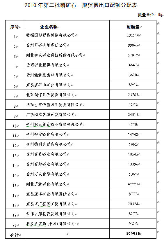 一、2010年第二批磷礦石一般貿易出口配額下達量為599950噸。