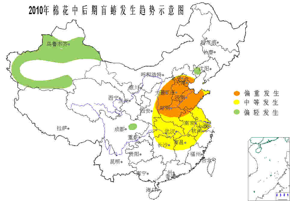 今年由于夏收作物收獲期推遲,導致后茬棉花播種期和生育期普遍偏晚,棉花長勢一般或略偏差,前期病蟲害總體為偏輕程度發生。中后期,轉基因棉抗蟲性有所下降,主栽品種普遍不抗枯黃萎病等病害,黃河和長江流域大部棉區降水偏多,預計棉花中后期 主要病蟲發生(sheng)(sheng)(sheng) 2.83 億(yi)畝次,棉(mian)(mian)鈴(ling)蟲、棉(mian)(mian)蚜、棉(mian)(mian)葉(xie)螨、棉(mian)(mian)盲(mang)蝽、 煙粉虱等蟲害(hai)發生(sheng)(sheng)(sheng) 2.28 億(yi)畝次,枯黃萎病、鈴(ling)病等病害(hai)發生(sheng)(sheng)(sheng) 0.55 億(yi)畝; 總體為中等程度發生(sheng)(sheng)(sheng),蟲害(hai) 發生(sheng)(sheng)(sheng)多輕于去年(nian),棉(mian)(mian)盲(mang)蝽和病害(hai)發生(sheng)(sheng)(sheng)重(zhong) 于去年(nian)。
