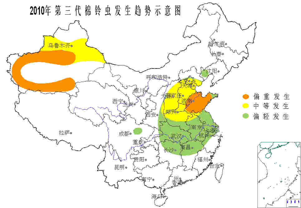 三(san)代棉鈴蟲(chong)預(yu)計 發生 3500 萬畝。 黃河流域和(he)新疆(jiang)(jiang)棉區中等發生,其中山東大部、新疆(jiang)(jiang)南疆(jiang)(jiang)偏重發生;長江(jiang)流域棉 區偏輕發生。 各地第二(er)代成(cheng)蟲(chong)盛期 (成(cheng)蟲(chong)盛期推(tui)后 3 天即為三(san)代卵盛期)較(jiao)常(chang)年推(tui)遲 3-9 天, 預(yu)測(ce)時期如下(xia):