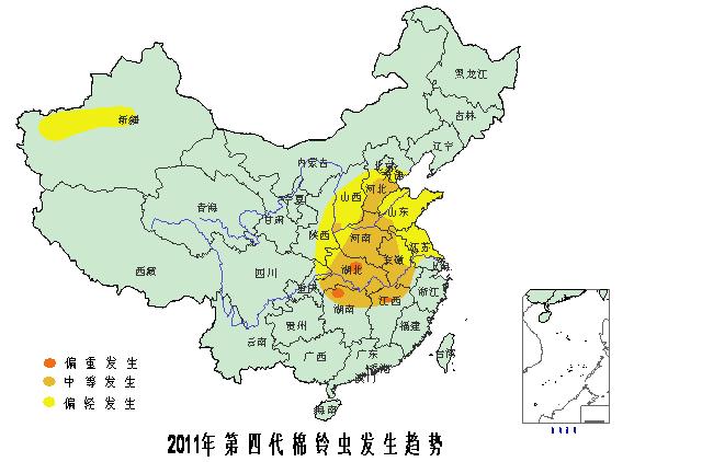 今年各棉(mian)區(qu)晚(wan)發遲(chi)衰棉(mian)田(tian)(tian)面積比(bi)率,山(shan)西(xi)(xi)、山(shan)東(dong)、江(jiang)(jiang)蘇、安(an)(an)徽(hui)、湖北(bei)、湖南(nan)、江(jiang)(jiang)西(xi)(xi)為21%-46%,天津(jin)、河北(bei)、陜西(xi)(xi)、河南(nan)、南(nan)疆(jiang)為4%-14%。與歷年均值相(xiang)比(bi),山(shan)西(xi)(xi)、江(jiang)(jiang)蘇、湖北(bei)增加(jia)19%-32%,山(shan)東(dong)、安(an)(an)徽(hui)、江(jiang)(jiang)西(xi)(xi)增加(jia)3%-12%,湖南(nan)接(jie)近,對(dui)第四(si)代(dai)棉(mian)鈴(ling)蟲在棉(mian)田(tian)(tian)發生(sheng)為害有(you)利;天津(jin)、河北(bei)、河南(nan)減少(shao)16%-22%,陜西(xi)(xi)、南(nan)疆(jiang)減少(shao)5%-7%,不利于(yu)第四(si)代(dai)棉(mian)鈴(ling)蟲在棉(mian)田(tian)(tian)的發生(sheng)與為害。