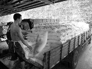 進行臨時轉堆,另一方面積極組織社會車輛從陸路運輸。目前每天汽車運輸在800噸左右,部分緩解了困局。 圖為該公司搬運工人裝車的情景。