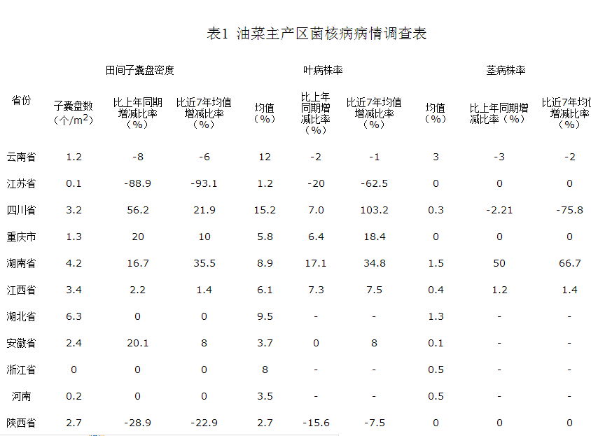 截至3月30日,長江(jiang)流域油菜主產區(qu)共(gong)計(ji)11省(市(shi))發生菌(jun)核(he)病,發生面(mian)積1231萬畝,比上年(nian)同期(qi)減(jian)少14.6%;大部地(di)區(qu)處(chu)于葉(xie)發病(bing)始盛期,局部地(di)區(qu)開(kai)始侵莖。發病(bing)地(di)區(qu)平均葉(xie)病(bing)株(zhu)率,四(si)川15.2%,云南12%,重慶、湖南、江(jiang)西、湖北和浙(zhe)江(jiang)為5%-10%,其他省份5%以下。與上年(nian)同期相(xiang)比,四川、重慶、湖南、江(jiang)西增(zeng)加,云南、江(jiang)蘇、陜西減少。云南、四川、湖南、江(jiang)西、湖北、浙江(jiang)、河南、安徽已經(jing)侵莖,云南、浙江(jiang)平均莖病株率(lv)為(wei)3%-5%左右,其他各(ge)省為2%以下。各地子囊(nang)盤(pan)密(mi)度(du)和菌(jun)核病(bing)病(bing)情具體(ti)數據見表1。