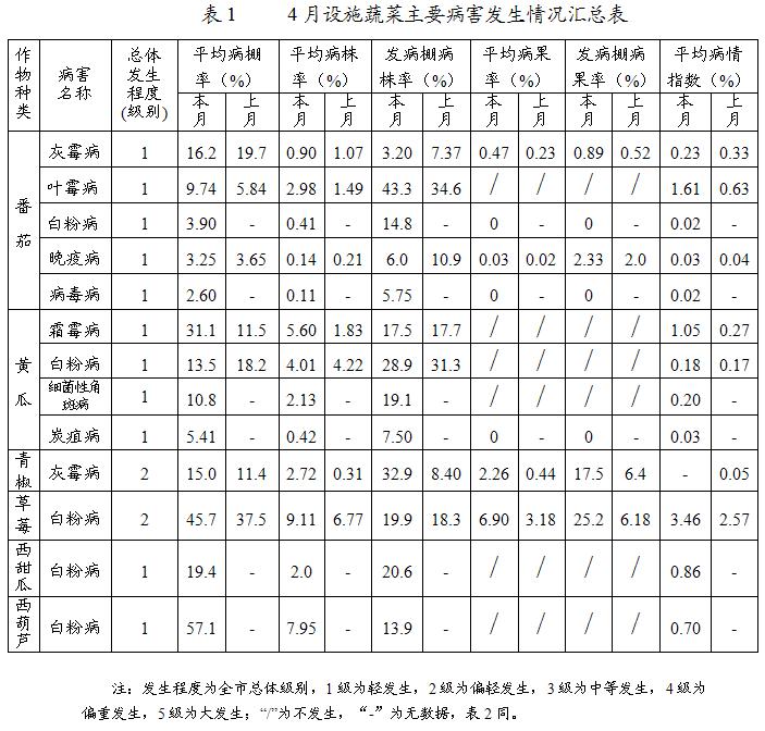 其他病害:西甜瓜及西葫蘆白粉病輕發生,茄子白粉病、西甜瓜霜霉病、西葫蘆灰霉病零星發生。