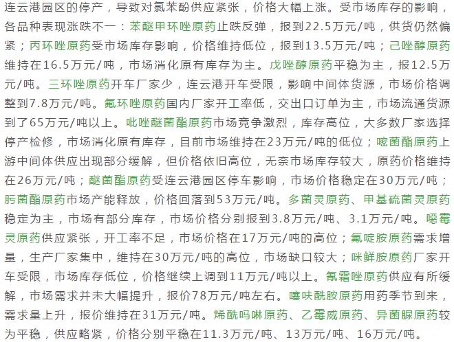 多款原藥貨源緊張價格提升