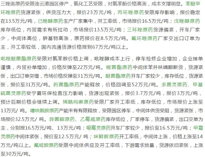 多款原藥貨源緊張價格提升