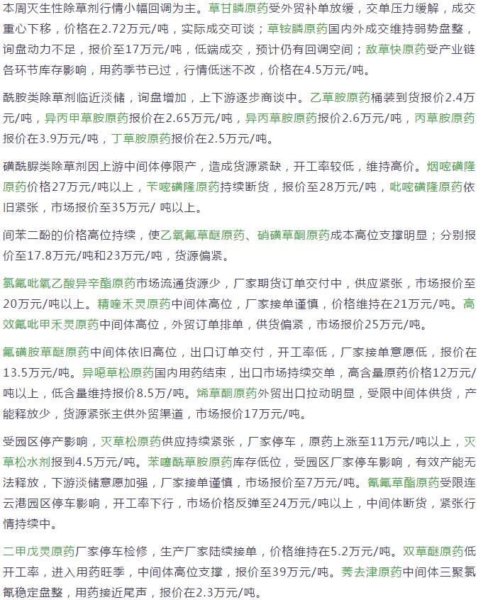7月份國內農藥原藥除草劑市場行情走勢