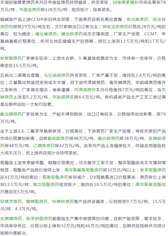 多款原藥貨源緊張價格提升