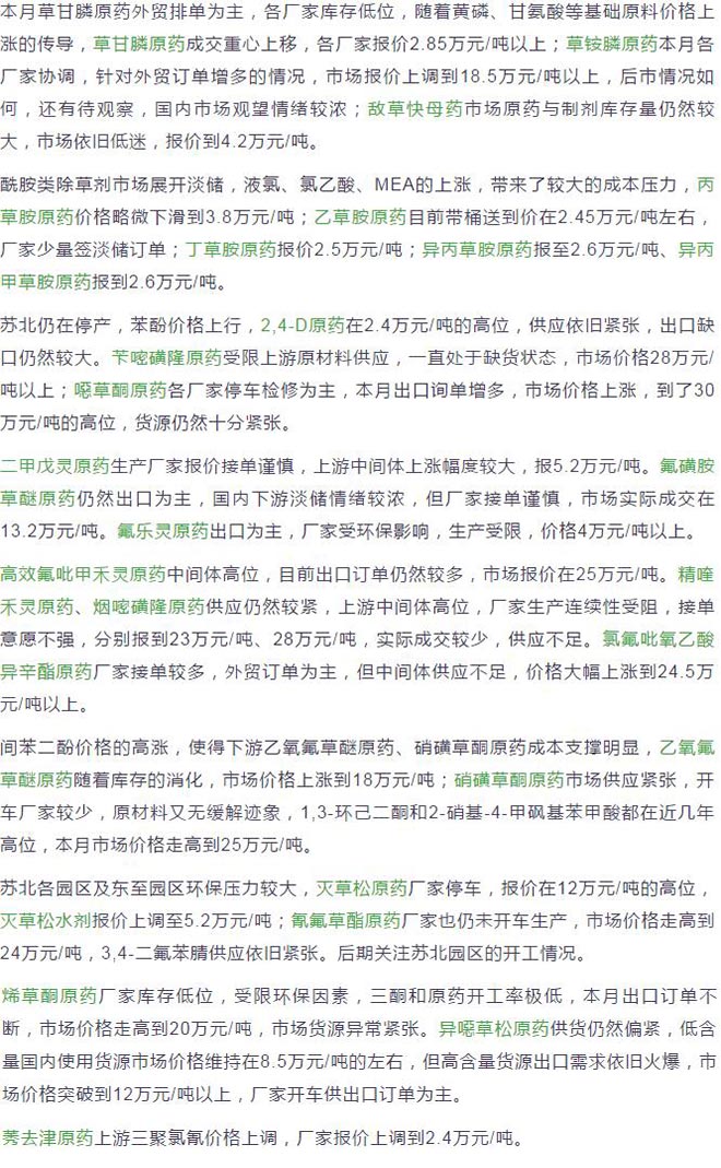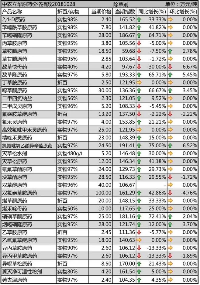 10月中旬國內農藥原藥除草劑市場行情走勢