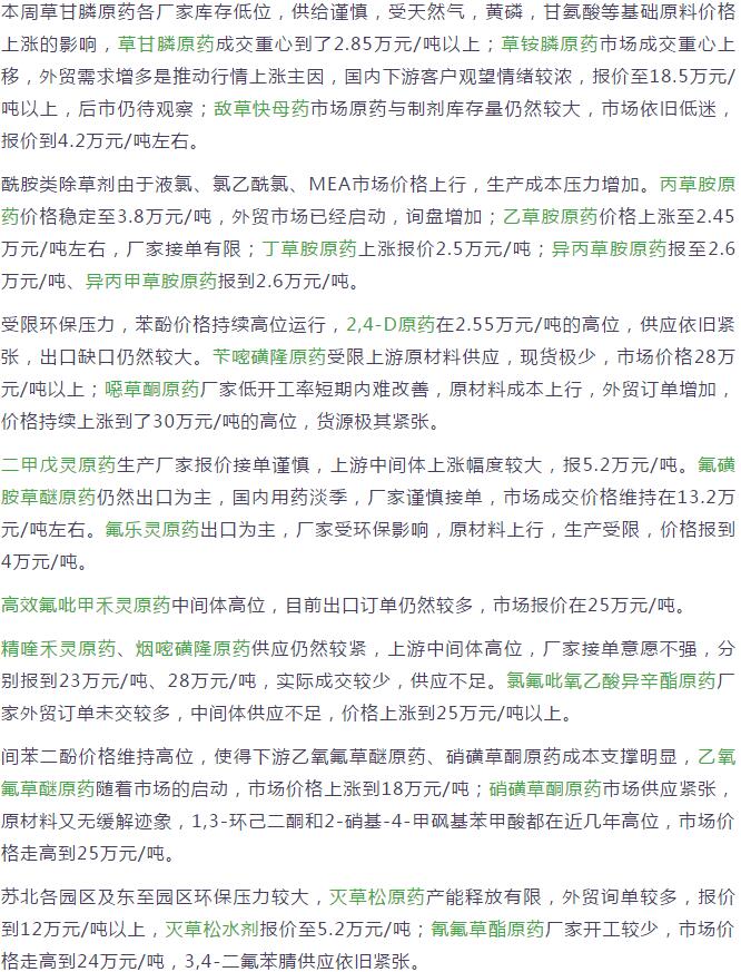 10月下旬國內農藥原藥除草劑價格走勢