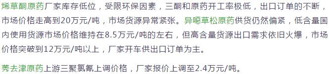 多款原藥貨源緊張價格提升