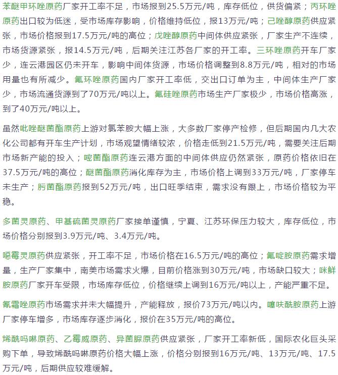 10月下旬國內農藥原藥殺菌劑價格走勢
