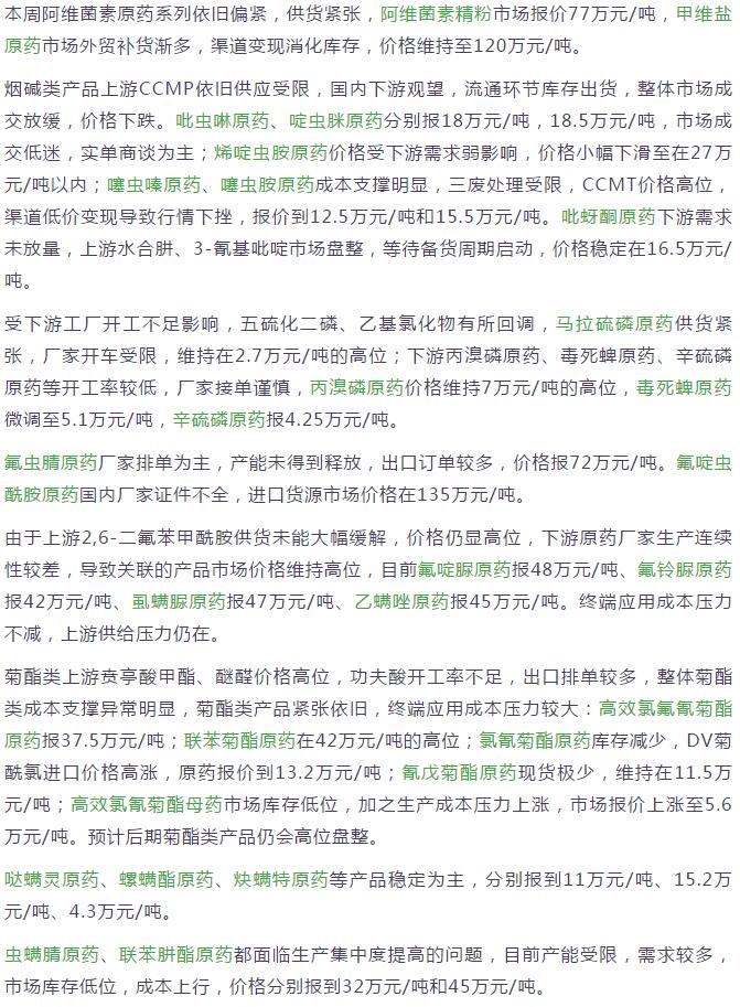 多款原藥貨源緊張價格提升