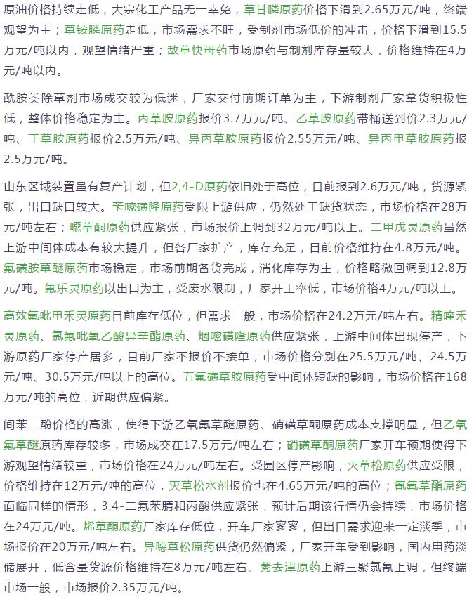 19年1月中旬國內農藥原藥除草劑價格走勢