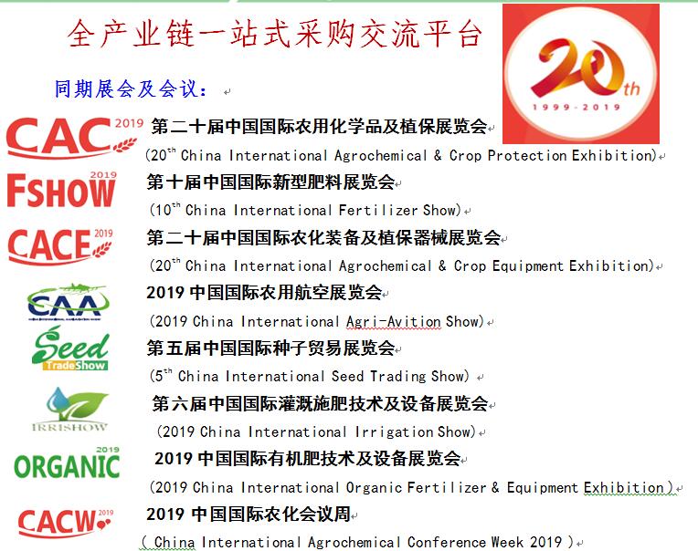 同期將在N1、N2、N3、N4、N5、N6、N7、N8、E7館舉辦第二十屆中國國際農用化學品及植保展覽會(CAC 2019)。同期還將繼續舉辦“中國國際肥料發展與貿易論壇”。
